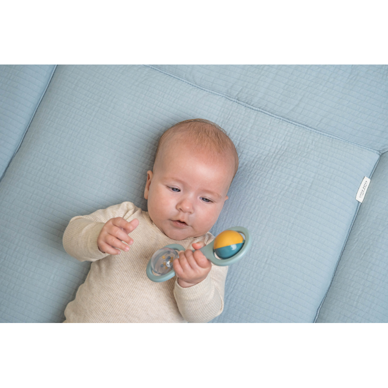 Hrkálka s dvoma otáčajúcimi sa guličkami je ideálna ako prvá hračka pre vaše bábätko. Pozornosť dieťaťa upútajú chrastiace korálky v priehľadnej guličke aj striedajúce sa farby pri otáčaní dvojfarebnej guličky. Hrkálka má tvar pre ľahké uchopenie malými detskými ručičkami.