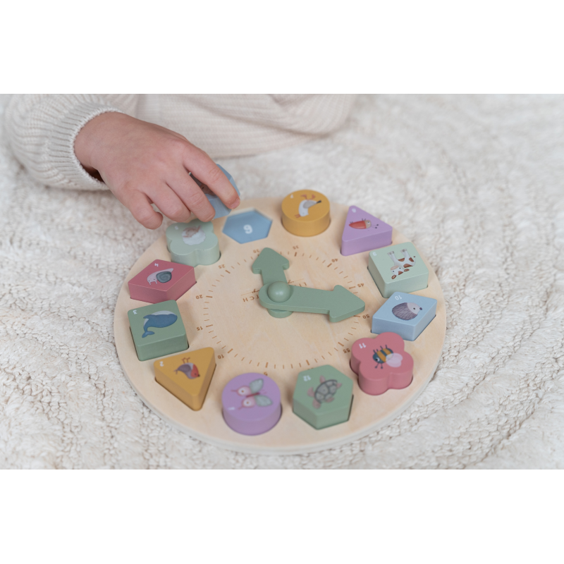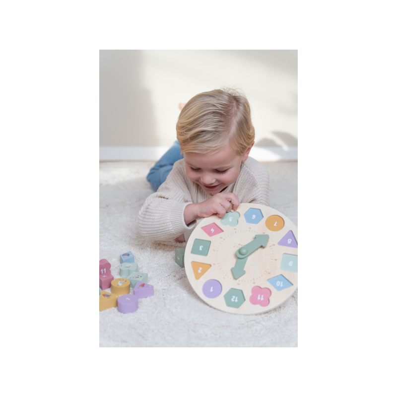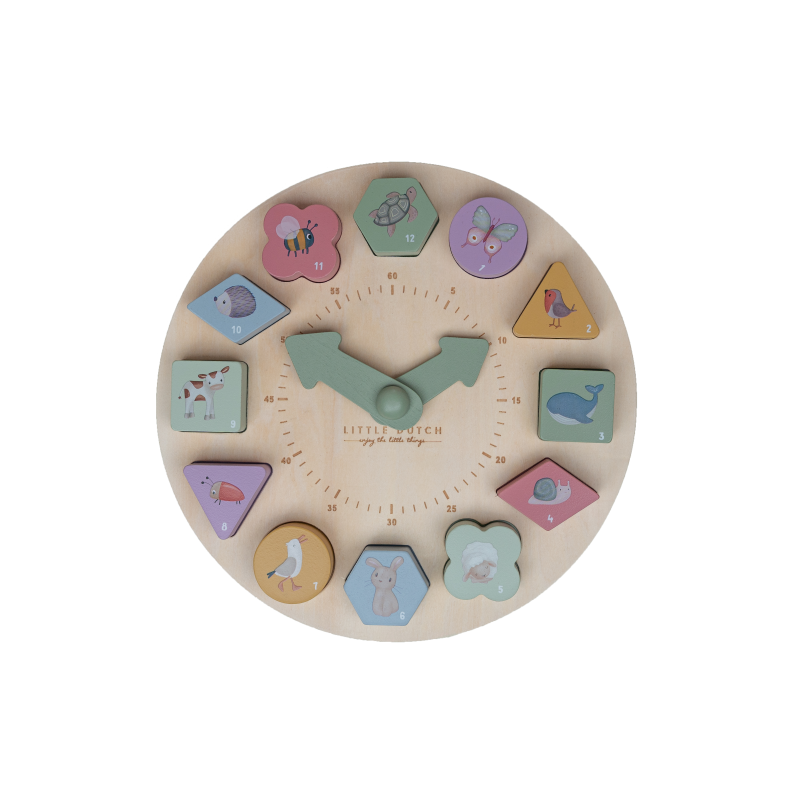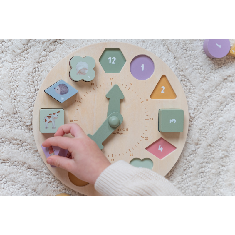 S pomocou puzzle hodín Little Dutch sa deti učia rozpoznávať farby, čísla, tvary i zvieratká.